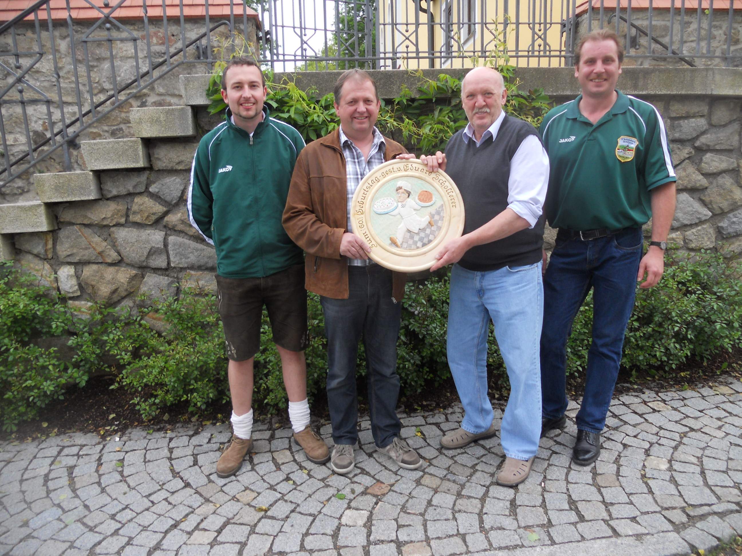 Bild: Edi Schollerer überreicht an Gewinner Josef Aich die schöne Scheibe und gratutuliert zum Gewinn, mit im Bild die Schützenmeister Michael Kräh (links) und Matthias Larsen.