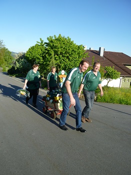Die drei Schützenmeister hatten extra einige Verse sowie einen schön geschmückten Leiterwagen mit allem nötigen, was ein Schirmherr so braucht, dabei.